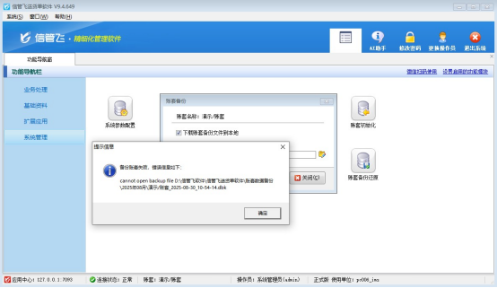 信管飛倉(cāng)庫(kù)管理軟件、信管飛出納記賬軟件、信管飛送貨單軟件、信管飛RMS等本地版軟件賬套數(shù)據(jù)默認(rèn)存儲(chǔ)在軟件安裝目錄下,支持對(duì)賬套數(shù)據(jù)進(jìn)行備份,如需要更換主機(jī)電腦,需要在原來(lái)的主機(jī)電腦上備份賬套數(shù)據(jù),將生成的備份文件復(fù)制到新的主機(jī)電腦上,然后在新的主機(jī)電腦上安裝軟件,使用備份文件還原數(shù)據(jù)即可。用戶(hù)在備份賬套時(shí)遇到備份失敗的情況,該如何處理?
