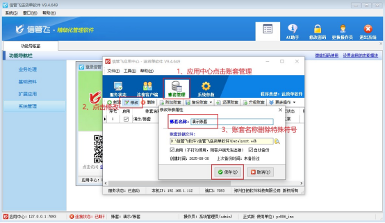 經(jīng)檢查備份賬套失敗的原因是賬套名稱(chēng)含有特殊字符“/”,處理方法:打開(kāi)應(yīng)用中心(紅色圖標(biāo))-----賬套管理---修改,賬套名稱(chēng)中符號(hào)/刪除,重新備份賬套即可。