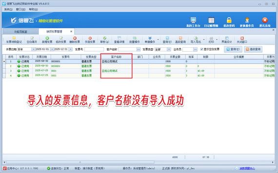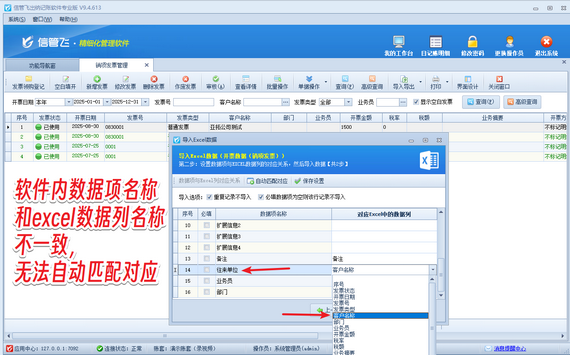 在企業(yè)的采購(gòu)與銷售流程中,發(fā)票管理至關(guān)重要。信管飛出納記賬軟件憑借其強(qiáng)大的發(fā)票管理功能,助力企業(yè)高效、精準(zhǔn)地處理發(fā)票信息。另外,軟件支持導(dǎo)入Excel快速導(dǎo)入發(fā)票信息。有用戶在軟件內(nèi)導(dǎo)出銷項(xiàng)發(fā)票Excel模版,維護(hù)數(shù)據(jù)后導(dǎo)入軟件,客戶名稱這一項(xiàng)導(dǎo)入不成功,如下圖所示。