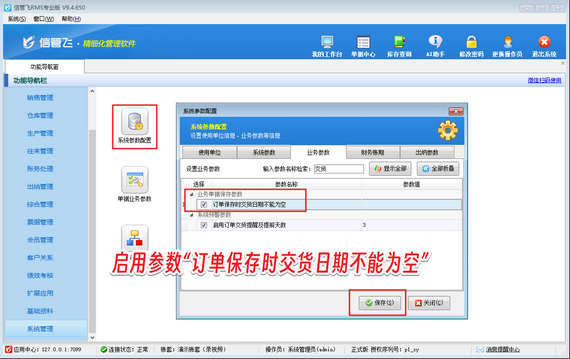 操作簡單,一鍵啟用:在功能導航窗點擊“系統管理”—》“系統參數設置”—》“業務參數”打開業務參數設置界面,在業務單據保存參數內勾選啟用參數“訂單保存時交貨日期不能為空”,然后保存參數設置即可。