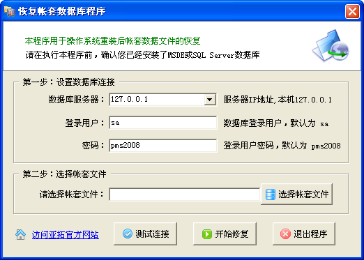 本程序可以在您重新安裝操作系統后,恢復帳套數據庫,支持新陽天進銷存系統、好好用財務出納記賬系統、好好用日記賬系統等全系列系統。如果您的機器無法啟動,有沒有備份的帳套數據文件(后綴名為.pmd)或者很久沒有備份過,可以通過本工具將帳套數據文件(后綴名為.mdf)直接恢復。此程序為最新版本 2001.05.26下載地址: http://www.uzaiuzai.com/download/DBTools.