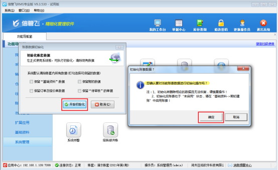 此文章演示視頻觀看鏈接:信管飛rms賬套初始化演示視頻 賬套初始化一般用于在正式使用軟件前,對賬套中的數據進行初始化,以便重新錄入數據。也可以在開賬后,發現期初數據有問題時,對數據進行初始化,以便重新開始錄入期初。賬套數據初始化后,會直接刪除相應的數據,因此務必提前做好備份,謹慎操作! &n