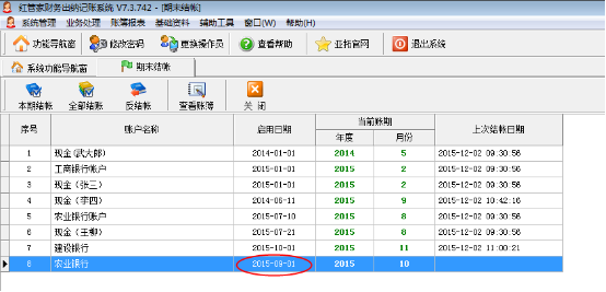 一、期末結賬功能描述 紅管家財務出納記賬系統包括期末結賬的功能,當本期(即本月)的業務已審核處理完畢,就可以進行期末結賬處理。結賬后自動進入下一個賬期(月份),12月份結賬后將進入下一個年度。結賬后如果發現單據錯誤或賬簿數據有誤,可以進行反結賬處理。 點擊主窗口菜單“業務處理”——》“期末結帳”系統進入“期末結帳”窗口,如圖1