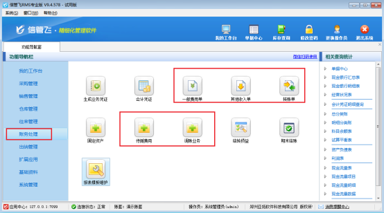 此文章相關演示視頻:專業版軟件如何顯示財務處理輔助單據演示視頻 信管飛RMS專業版軟件支持使用財務處理功能,部分用戶在使用最新版本軟件時,會發現財務處理功能沒有一般費用單、其他收入單、調賬業務等功能,這是因為未勾選“顯示財務處理輔助單據”參數導致的,本文以“RMS專業版”為例介紹下如何顯示財務處理輔助
