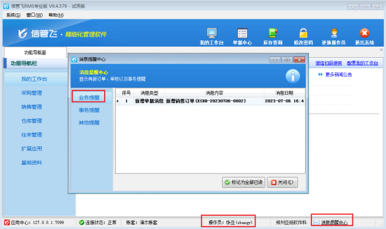 此文章相關演示視頻:如何啟用消息提醒功能演示視頻 信管飛軟件中客戶下訂單后,新增訂單支持設置消息提醒功能,啟用消息提醒功能后設置消息接收人員,該人員在登錄軟件時,點擊消息提醒中心即可查看新增訂單單據并查看單據詳情,下面以信管飛RMS專業版為例介紹一下消息提醒功能。 &