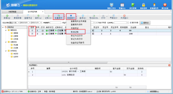 此文章相關(guān)演示視頻:信管飛RMS軟件會(huì)計(jì)憑證如何批量取消記賬演示視頻 信管飛RMS專業(yè)版包含財(cái)務(wù)處理功能可用來登記會(huì)計(jì)憑證,有用戶在記賬之后需要修改憑證,已過賬狀態(tài)下無法進(jìn)行修改,需要先把憑證取消記賬后才能進(jìn)行反審修改,如果需要修改的已過賬憑證過多,一