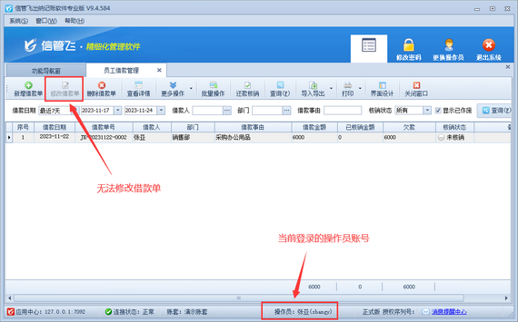 信管飛出納記賬軟件專業版的員工借款管理及還款管理可以對企業員工借款、還款進行流程化登記管理,提高了企業管理效率。本篇文章介紹一下出納記賬軟件如何設置操作員不可修改員工借款單? 演示視頻觀看鏈接:出納記賬軟件如何設置操作員不可修改員工借款單演示視頻 登錄軟件,在功能導航窗點擊“系統管理”—》