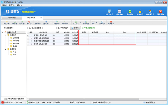 信管飛RMS支持基礎(chǔ)資料數(shù)據(jù)維護,包括客戶信息、供應(yīng)商信息、商品信息、員工信息、倉庫信息、資金賬戶等信息,另外,也支持對基礎(chǔ)資料數(shù)據(jù)項進行權(quán)限控制,本篇文章介紹一下如何設(shè)置操作員不可查看供應(yīng)商聯(lián)系信息? 演示視頻觀看鏈接:信管飛RMS如何設(shè)置操作員不可查看供應(yīng)商聯(lián)系信息演示視頻 首先需要啟