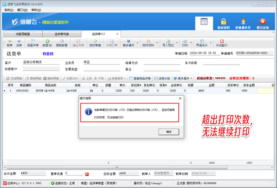 企業(yè)管理中,單據(jù)打印至關(guān)重要。但如何避免單據(jù)重復(fù)打印、修改單據(jù)導(dǎo)致的混亂?信管飛軟件為你提供完美解決方案! 信管飛軟件支持設(shè)置報(bào)表打印次數(shù)限制,確保單據(jù)打印的合規(guī)性。一旦打印次數(shù)達(dá)到預(yù)設(shè)上限,系統(tǒng)將自動提示,防止重復(fù)打印。 以信管飛送貨單軟件為例,通過簡單設(shè)置,即可實(shí)現(xiàn)操作員打印次數(shù)權(quán)限控