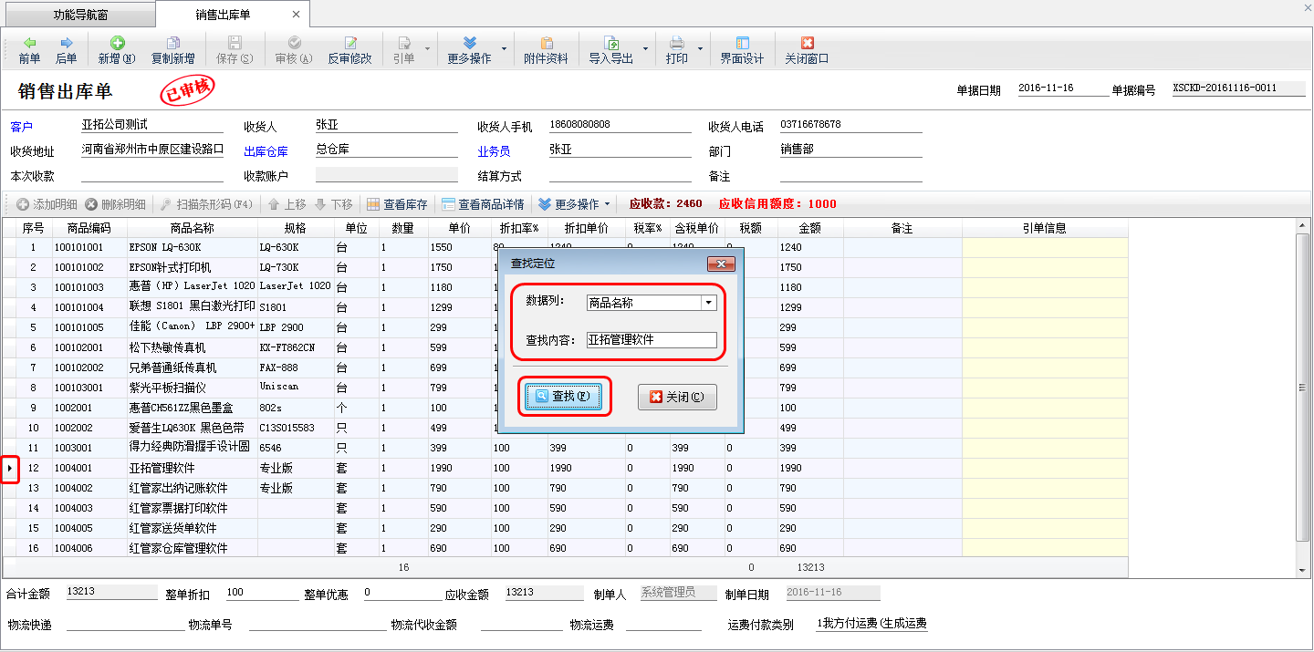 亞拓管理軟件(精細化管理軟件、進銷存管理軟件、記賬軟件)及紅管家倉庫管理軟件(庫存管理軟件)業務單據明細內支持查找定位功能,可以快速定位單據明細內滿足條件的明細記錄,本篇文章以亞拓管理軟件為例詳細介紹下業務單據明細內查找定位功能如何使用。 打開業務單據(本篇文章以“銷售出庫單”為例),在單據明細工具欄點擊“更多操作”—》“查