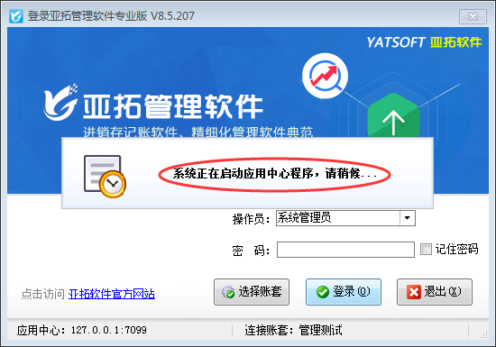 亞拓軟件新架構版本安裝完成后會有兩個圖標,紅色圖標為應用中心、藍色圖標為客戶端程序。之前版本使用需要時需要先打開紅色的應用中心然后再打開藍色的客戶端程序。為了提高用戶使用便捷性,軟件解決這一問題,支持應用中心未開啟時直接登錄客戶端程序系統會自動啟動應用中心程序。 以亞拓管理軟件為例示范下,直接打開客戶