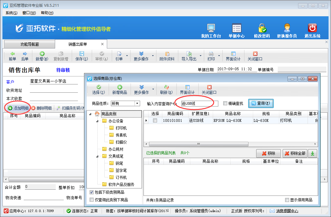 亞拓管理軟件、紅管家倉庫管理軟件和紅管家送貨單軟件開單時都支持選擇系統(tǒng)內(nèi)已錄入的商品信息,進行快速選擇商品來開單。開單時,選擇商品窗口,可以根據(jù)商品編碼、商品名稱、規(guī)格、條形碼等信息查詢商品,如果“商品擴展信息”錄入了數(shù)據(jù),我們也可以根據(jù)“商品擴展信息”進行查詢。下面我們以亞拓管理軟件專業(yè)版為例介紹一下銷售出庫單開單選擇商品時,根據(jù)“商品擴展信息”查詢商品的操