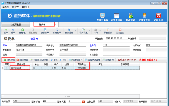 紅管家送貨單軟件、亞拓管理軟件、紅管家倉(cāng)庫(kù)管理軟件都支持管理商品信息,支持開(kāi)單后直接選擇提前維護(hù)好的商品信息資料,有的商品存在商品備注信息,本文章介紹如何在開(kāi)單的時(shí)候選擇商品后把商品信息中的備注信息直接獲取過(guò)來(lái)。不需再在開(kāi)單時(shí)候再次輸入。 以送貨單軟件為例,示范下如何開(kāi)單自動(dòng)獲取商品備注信息。首先需要“基礎(chǔ)資料