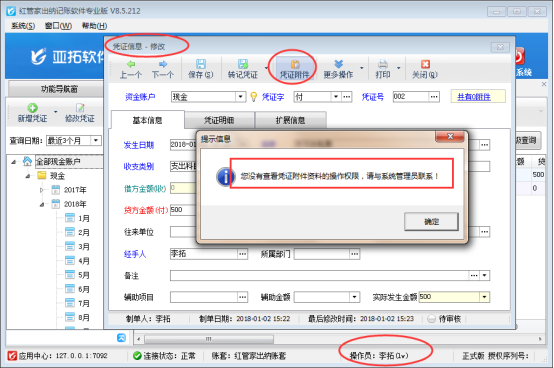 紅管家出納記賬軟件、亞拓管理軟件標(biāo)準(zhǔn)版、專業(yè)版支持日記賬導(dǎo)入憑證附件資料,更清晰的管理每筆日記賬的票據(jù)詳情信息。為避免每個(gè)人都查看到日記賬的詳細(xì)開(kāi)票信息,軟件支持控制操作員的可查看憑證附件資料權(quán)限。 以出納記賬軟件專業(yè)版本為例,示范下如何控制其他操作員的可查看附件資料權(quán)限。在系統(tǒng)管理—》“操作員及授權(quán)