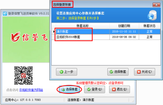 亞拓軟件旗下的信管飛RMS、信管飛倉庫管理軟件、信管飛送貨單軟件、信管飛出納記賬軟件、信管飛票據打印軟件等軟件程序安裝后會顯示兩個圖標,一個是應用中心程序(紅色圖標),一個是客戶端程序(藍色圖標)。這些軟件都含有賬套管理功能,在應用中心里面可以建立多個賬套,已使用的帳套如果不再繼續使用,可以停用帳套,停用帳套后,客戶端程序登錄時無法連接該帳套。我們以信管飛送貨