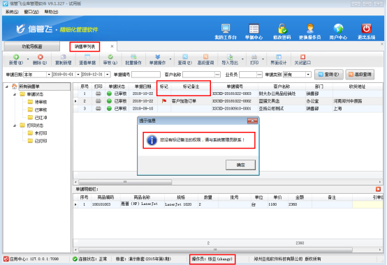 信管飛倉庫管理軟件可以對銷售單列表、采購單列表、銷售訂單列表、采購訂單列表進行標記備注。如果不允許操作員標記單據備注,可以對操作員取消“標記單據備注”的權限。下面我們介紹一下在信管飛倉庫管理軟件中設置操作員不可標記單據備注的操作步驟。 系統管理員登錄軟件后,在功能導航窗點“系統管理”—》“操作員及授權”即可進入“操作員管理及