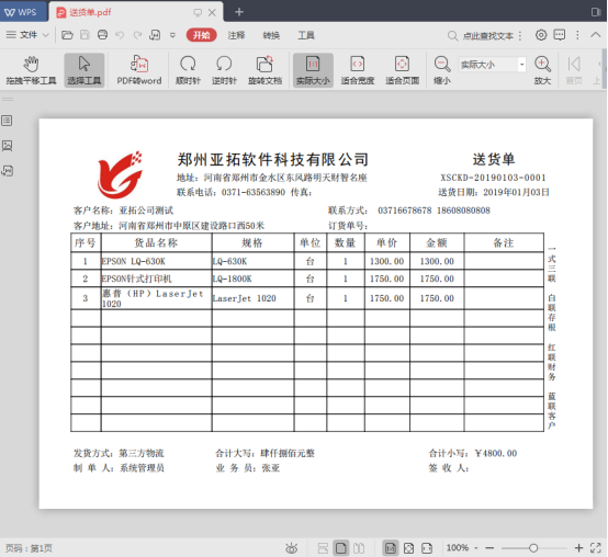 信管飛送貨單軟件、信管飛RMS、信管飛倉庫管理軟件等都支持打印送貨單(銷售單),軟件支持把送貨單預覽界面導出到Excel文件、Html文件、Text文件及jpg、pdf等電子檔格式,方便用戶導出送貨單的電子檔給客戶看,方便客戶可以隨時查看送貨單內容。下面我們以信管飛送貨單軟件為例講一下如何把送貨單預覽界面導出為pdf格式。