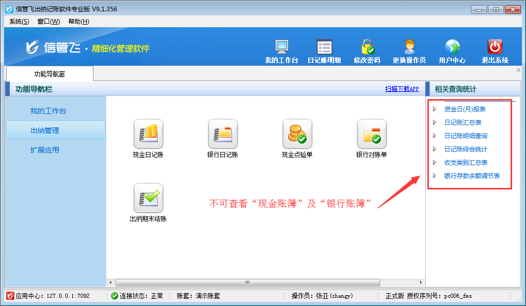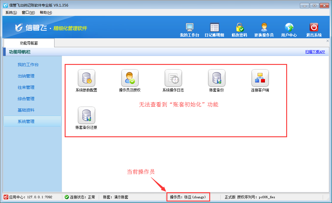 信管飛出納記賬軟件內包含豐富的記賬統計表格,如現金賬簿、銀行賬簿、資金日(月)報表、收支類別匯總表等。如果不希望員工賬號登錄后查看到這些報表,如何設置呢?本篇文章以信管飛出納記賬軟件專業版為例演示一下出納記賬軟件內如何設置操作員不可查看現金及銀行賬簿。 登錄軟件,在功能導航窗點擊“系統管理”—》“操作員及授權”,進入“操作員