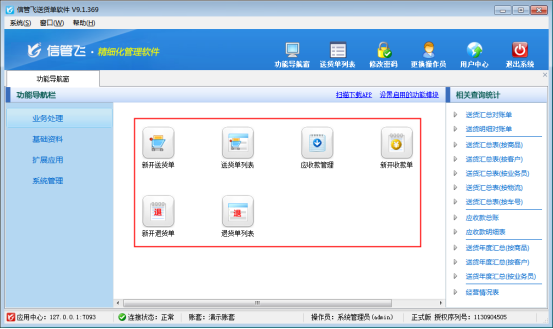 信管飛送貨單軟件是集送貨單、退貨單、訂單、銷售收款等功能為一體的送貨管理及打印軟件。 軟件界面默認顯示所有的功能模塊,主要包括新開送貨單、送貨單列表、應收款管理、新開收款單、收款單列表、新開退貨單、退貨單列表、新開訂單、訂單列表。軟件支持隱藏不需要的功能模塊,下邊我們在信管飛送貨單軟件中示范如何隱藏不