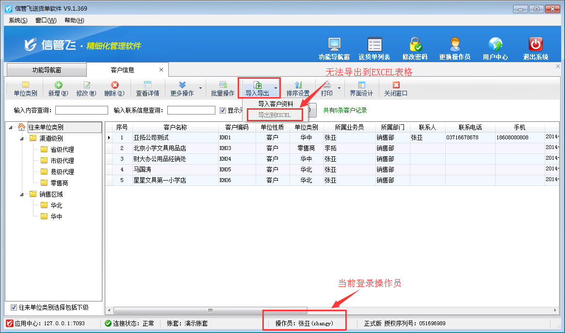 信管飛送貨單軟件、信管飛RMS、信管飛倉庫管理軟件等都支持管理基礎資料信息和允許設置多個操作員進行登錄軟件。軟件支持將基礎資料信息以EXCEL的形式導出放到自定義的文件夾內以供備份或保存,如果需要設置操作員不允許導出客戶信息,如何設置?本文以信管飛送貨單軟件為例,示范下如何設置操作員不可導出客戶信息。 在功能導航窗點擊“系統