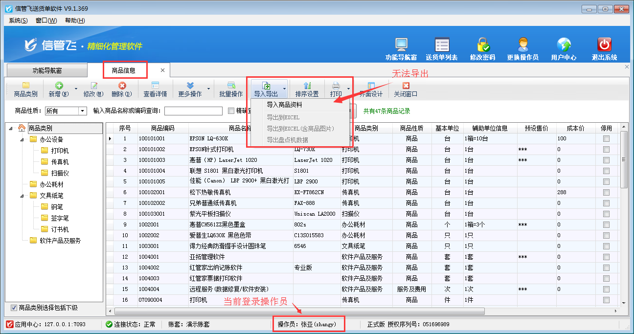 信管飛送貨單軟件、信管飛RMS、信管飛倉庫管理軟件等都支持管理基礎資料信息和允許設置多個操作員進行登錄軟件。軟件支持將基礎資料信息以EXCEL的形式導出放到自定義的文件夾內以供備份或保存,如果需要設置操作員不允許導出商品信息,如何設置?本文以信管飛送貨單軟件為例,示范下如何設置操作員不可導出商品信息。 在功能導航窗點擊“系統