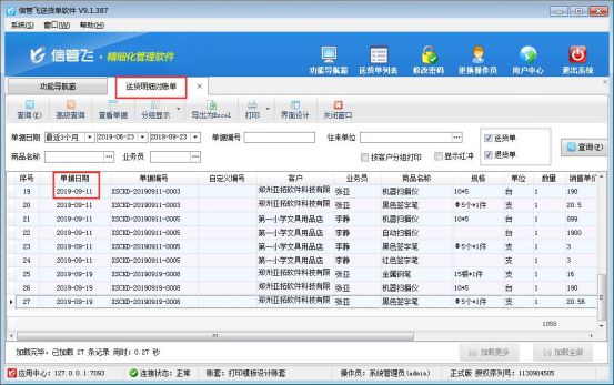 信管飛送貨單軟件支持開送貨單以及支持對已開單據(jù)明細(xì)匯總在送貨明細(xì)對賬單重,方便對賬。有時候需要把明細(xì)對賬單導(dǎo)出發(fā)給對應(yīng)的客戶進(jìn)行對賬。軟件送貨明細(xì)對賬單默認(rèn)日期格式是顯示時間的,為了導(dǎo)出Excel文件更簡潔明了,軟件可設(shè)置送貨明細(xì)對賬單表的日期格式不顯示時間,只顯示出單據(jù)日期。 功能導(dǎo)航窗選擇“業(yè)務(wù)處
