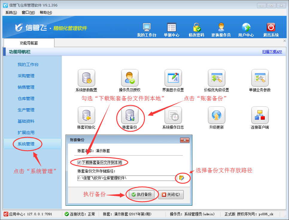 信管飛倉庫管理軟件、信管飛出納記賬軟件、信管飛送貨單軟件、信管飛RMS等軟件賬套數(shù)據(jù)默認(rèn)存儲在軟件安裝目錄下,支持對賬套數(shù)據(jù)進(jìn)行備份,如需要更換主機電腦,需要在原來的主機電腦上備份賬套數(shù)據(jù),將生成的備份文件復(fù)制到新的主機電腦上,然后在新的主機電腦上安裝軟件,使用備份文件還原數(shù)據(jù)即可。 以信管飛倉庫管理軟件為例,演示一下更換電