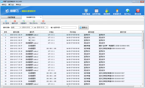 信管飛RMS、信管飛送貨單軟件、信管飛出納記賬軟件、信管飛倉庫管理軟件和信管飛票據(jù)打印軟件都可以實現(xiàn)多個操作員登錄使用軟件的功能,操作員登錄軟件后,系統(tǒng)會生成操作日志,在系統(tǒng)操作日志管理中可以查看每個操作員的登錄退出記錄以及重要操作的記錄。通過查詢操作員的操作日志,可以掌握不同操作員的登錄退出情況,以及不同操作員的重要操作記錄。下面以信管飛送貨單軟件介紹一下如