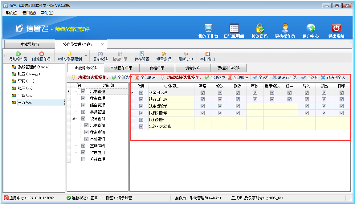 進(jìn)銷存管理軟件、倉庫管理軟件、出納記賬軟件、送貨單軟件等都支持設(shè)置多個操作員登錄軟件,本文以出納記賬軟件為例演示一下如何新增操作員賬號并設(shè)置操作員權(quán)限? 操作員及授權(quán)實現(xiàn)對操作員的管理和權(quán)限分配。權(quán)限分為功能模塊權(quán)限、其他操作權(quán)限、數(shù)據(jù)權(quán)限等。另外部分權(quán)限(如資金賬戶權(quán)限)需要在“系統(tǒng)參數(shù)配置”中啟用相應(yīng)的參數(shù),才可以使用。