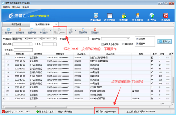 信管飛送貨單軟件為集訂單管理、送貨管理、收款結算等功能并支持送貨明細對賬及業務綜合對賬的送貨單打印軟件。軟件根據錄入的每張訂單及送貨單等數據,可以自動生成統計報表,完成企業銷售統計查詢和與客戶送貨明細對賬的目的,如下圖所示。如果不希望操作員賬號登錄后導出送貨明細對賬單,如何設置呢?本篇文章介紹一下具體操作步驟。 演示視頻觀看