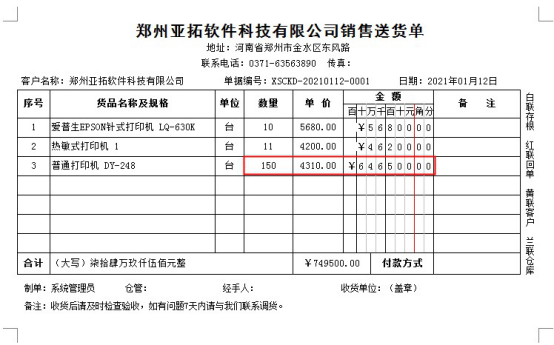 信管飛送貨單軟件、信管飛RMS軟件等都支持打印單據,軟件內置了十幾種打印模板以供使用。默認打印模板的金額是按財務樣式進行顯示的,默認金額格式是按7位顯示,只顯示到萬,如果出現金額超過萬位會顯示不出來(如下圖所示),本文以“信管飛送貨單軟件”為例,示范下如何修改金額樣式的顯示數字個數。 打開送貨單開單界