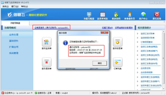 信管飛送貨單軟件、信管飛RMS軟件、信管飛倉庫管理軟件、信管飛出納記賬軟件等都支持云帳套服務,云賬套服務是信管飛軟件推出的數據存在云端,通過通行證賬號和密碼連接云端數據,此服務不限時間和地點,有網絡就可以使用。云賬套服務按年收費,為避免不清楚什么時間到期續費影響軟件使用,軟件增加可在登錄界面查看服務期的功能。 &n