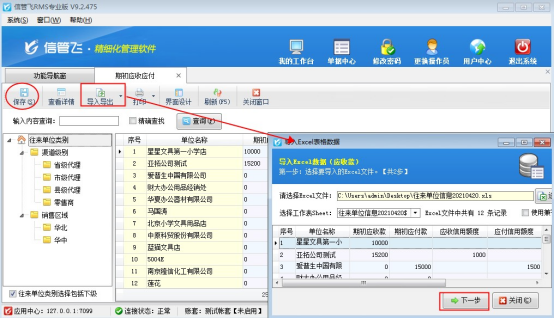 信管飛RMS軟件的新帳套在開賬前可先錄入好期初業務數據,所謂期初是指計劃使用軟件日期(即開賬日期)前的業務數據。軟件中的期初應收應付功能支持批量導入應收應付款。以信管飛RMS專業版為例介紹一下如何批量錄入客戶的期初應收應付款。 在功能導航窗,點“基礎資料”—》“期初建賬”—》“期初應收應付”,即可進入“