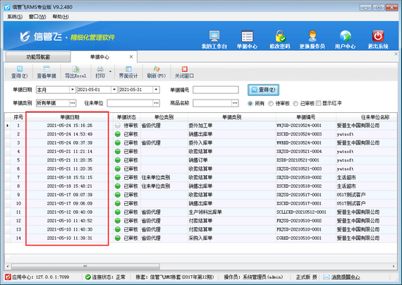 信管飛RMS是集采購管理、銷售管理、庫存管理、往來應(yīng)收應(yīng)付款等一體化的進銷存管理軟件,軟件支持單據(jù)中心功能,在單據(jù)中心內(nèi)可以查詢到軟件內(nèi)所填開的所有業(yè)務(wù)單據(jù),可以根據(jù)單據(jù)日期、單據(jù)編號、單據(jù)類別、往來單位、商品名稱、審核狀態(tài)等信息查詢所需單據(jù),查詢結(jié)果默認是根據(jù)單據(jù)日期正序顯示,如下圖所示。 如需設(shè)置單據(jù)中心按單據(jù)日期倒敘顯