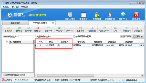 生產(chǎn)模板,即BOM清單(物料清單),可配置每生產(chǎn)一個標準單位的產(chǎn)品需要的原材料種類和數(shù)量。生產(chǎn)模板已審核后,不允許直接修改或者刪除,如下圖所示。如生產(chǎn)模板數(shù)據(jù)維護有誤,需要先將已審核的生產(chǎn)模板反審至待審核的狀態(tài),然后在修改(刪除)生產(chǎn)模板即可。 在生產(chǎn)模板BOM管理界面,選擇一個已審核的生產(chǎn)模板,在工具欄中點擊“反審”按鈕,