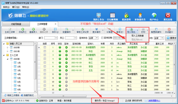 信管飛出納記賬軟件專業(yè)版包括工資管理功能,支持自定義工資模板管理員工工資單,可根據(jù)設(shè)置的工資模板快速生成工資單,支持從上月工資單復(fù)制工資項目數(shù)據(jù)。為了避免操作員導(dǎo)出工資單,軟件中可以設(shè)置操作員不可導(dǎo)出工資記錄權(quán)限。下邊我們在軟件中示范下設(shè)置操作員不可導(dǎo)出工資記錄權(quán)限的操作步驟。 登錄軟件,在功能導(dǎo)航窗點擊“系統(tǒng)管理”—》“操
