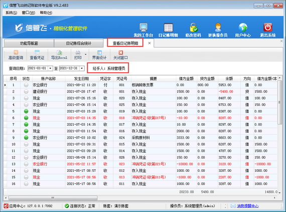 出納記賬軟件登記日記賬憑證時可以選擇經手人信息,方便后續根據經手人進行查詢統計數據,本篇文章介紹一下出納記賬軟件中如何按經手人統計? 在功能導航窗點擊“出納管理”—》“現金日記賬”,新增日記賬憑證時選擇一下經手人信息,如下圖所示。 然后在“出納管理”模塊最右側的“相關查詢統計”內點擊“日記