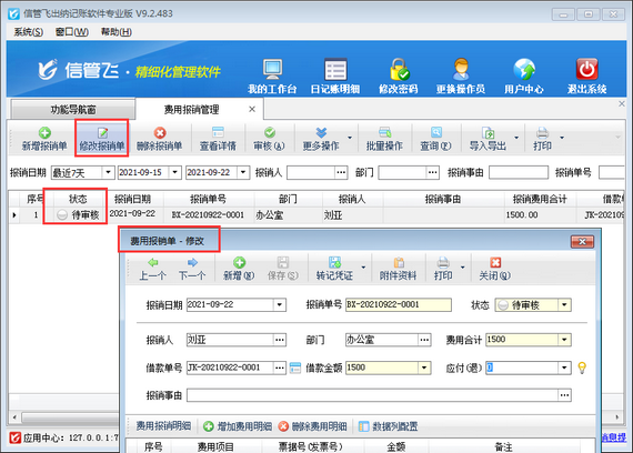 在日常工作中,因為臨時事件的發生,員工經常會自己墊付工作所需要的各項費用。這些費用在月末時可以填寫費用報銷單進行統一的報銷。信管飛出納記賬軟件專業版有費用報銷管理功能,可以管理費用報銷單。 演示視頻觀看鏈接:已審核的費用報銷單如何反審修改演示視頻 費用報銷單保存審核后默認不允許直接修改,如