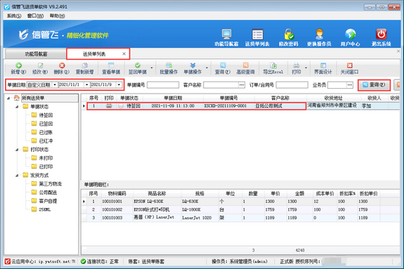 信管飛RMS軟件、信管飛送貨單軟件、信管飛倉庫管理軟件開單界面單據(jù)保存后默認(rèn)單據(jù)日期和單據(jù)編號(hào)是當(dāng)天的。有些客戶需要提前開單,第二天直接出庫,這種情況該如何處理呢?軟件支持提前錄入單據(jù)。下面以信管飛送貨單軟件為例,演示下如何提前開單? 在功能導(dǎo)航窗點(diǎn)擊“業(yè)務(wù)處理”—》“新開送貨單”打開送貨單,錄入單據(jù)信息。如下圖所示:&nbs