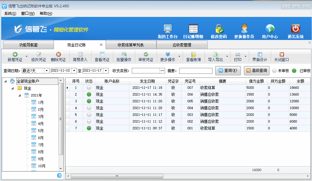 信管飛出納記賬軟件可登記客戶的應(yīng)收應(yīng)付款以及管理出納日記賬,軟件支持結(jié)算應(yīng)收應(yīng)付款可轉(zhuǎn)記出納憑證。有用戶存在流程是先登記應(yīng)收款進(jìn)行結(jié)算,結(jié)算單轉(zhuǎn)記出納憑證,出納人員實(shí)際收款后先審核出納憑證,再審核結(jié)算單,結(jié)算單審核后則整個流程完成。 為便捷用戶操作,軟件支持設(shè)置憑證審核時自動審核相關(guān)結(jié)算單,本文以“信