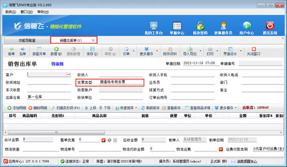 信管飛RMS軟件支持開銷售單選擇發(fā)票類型,可以根據(jù)實(shí)際需要選擇不同的開發(fā)票方式。在企業(yè)的經(jīng)營管理過程中,為了快速開單,提高效率,有時需要對單據(jù)設(shè)置默認(rèn)值。本篇文章中以信管飛RMS軟件專業(yè)版為例詳細(xì)介紹下如何設(shè)置單據(jù)默認(rèn)發(fā)票類型。在功能導(dǎo)航窗點(diǎn)“銷售管理”—》“銷售出庫單”,進(jìn)入銷售出庫單界面,點(diǎn)擊“更多操作”按鈕,找到“設(shè)置單據(jù)默認(rèn)值”,如下圖所示: