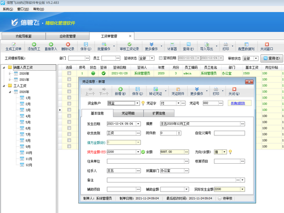 信管飛出納記賬軟件專業(yè)版包括工資管理功能,支持自定義工資模板,可根據(jù)設(shè)置的工資模板快速生成工資單,支持從上月工資單復(fù)制工資項目數(shù)據(jù),每月工資發(fā)放后,可將工資記錄轉(zhuǎn)記為日記賬憑證,本文介紹一下出納記賬軟件中工資單如何轉(zhuǎn)記憑證? 在功能導(dǎo)航窗點(diǎn)擊“綜合管理”—》“工資單管理”,打開工資單管理界面,在工資記錄列表中選擇需要轉(zhuǎn)記日記