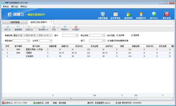 信管飛送貨單軟件為集訂單管理、送貨管理、收款結(jié)算等功能并支持送貨明細(xì)對賬及業(yè)務(wù)綜合對賬的送貨單打印軟件。軟件根據(jù)錄入的每張訂單及送貨單等數(shù)據(jù),可以自動生成統(tǒng)計報表,完成企業(yè)銷售統(tǒng)計查詢和與客戶送貨明細(xì)對賬的目的,如下圖所示。 其中,送貨匯總表(按客戶)可根據(jù)單據(jù)日期、客戶名稱、商品名稱等查詢條件,統(tǒng)計銷售給每個客戶的商品匯總