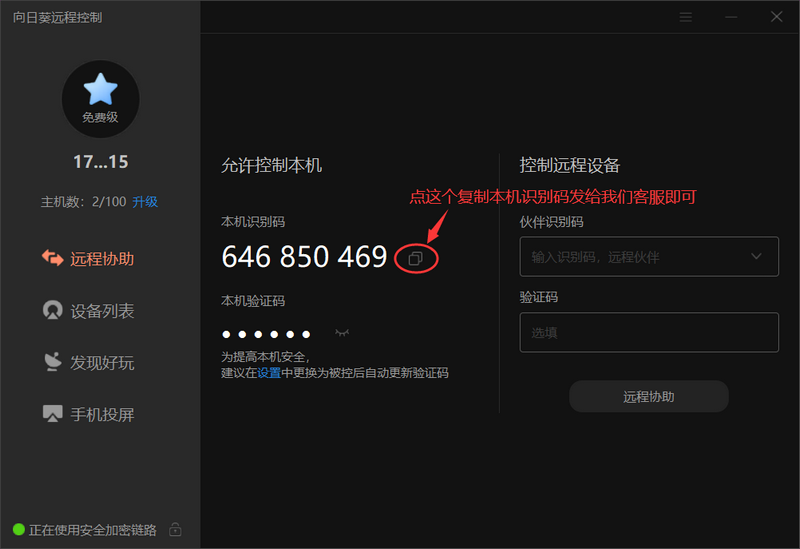 向日葵遠(yuǎn)程控制需要提供識(shí)別碼(每臺(tái)電腦的唯一碼),直接把識(shí)別碼復(fù)制或截圖發(fā)給我們客服即可。我們邀請(qǐng)遠(yuǎn)程后需要你在電腦右下角點(diǎn)“確認(rèn)”才可以連接。如下圖所示: