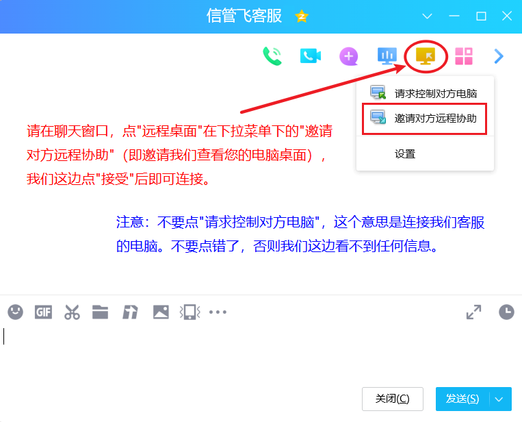 打開QQ并添加我們的客服QQ號(hào)為好友(添加任一客服QQ即可,請(qǐng)勿重復(fù)添加),然后在QQ聊天窗口,點(diǎn)擊“遠(yuǎn)程桌面”-》“邀請(qǐng)對(duì)方協(xié)助”如下圖所示(我們以QQ9.4.5版本為例,之前版本的操作方法基本一樣):