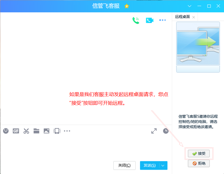 部分情況下,我們客服也會(huì)主動(dòng)發(fā)起遠(yuǎn)程桌面請(qǐng)求,請(qǐng)?jiān)赒Q聊天窗口,點(diǎn)“接收”按鈕同意遠(yuǎn)程桌面,我們就可以看到您電腦桌面,如下圖所示: